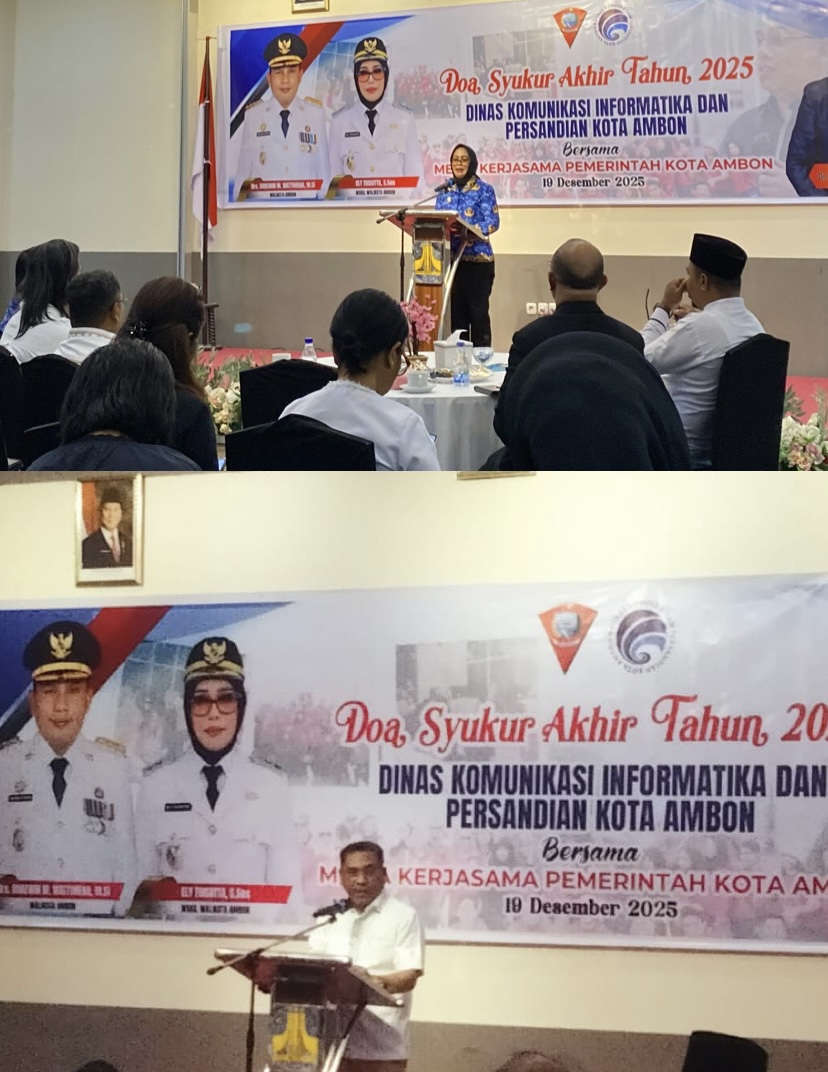 JURNALMALUKU—Menutup rangkaian kinerja sepanjang tahun 2025, Dinas Komunikasi, Informatika dan Persandian Kota Ambon menggelar Doa Syukur Akhir Tahun 2025 sebagai wujud ungkapan terima kasih kepada Tuhan Yang Maha Esa sekaligus momentum refleksi atas perjalanan pelayanan publik yang telah dilalui. Kegiatan yang berlangsung khidmat di Hotel Manise, Kota Ambon, Jumat (19/12/2025), ini dihadiri pimpinan daerah, jajaran ASN Dinas Kominfo, serta mitra media massa.