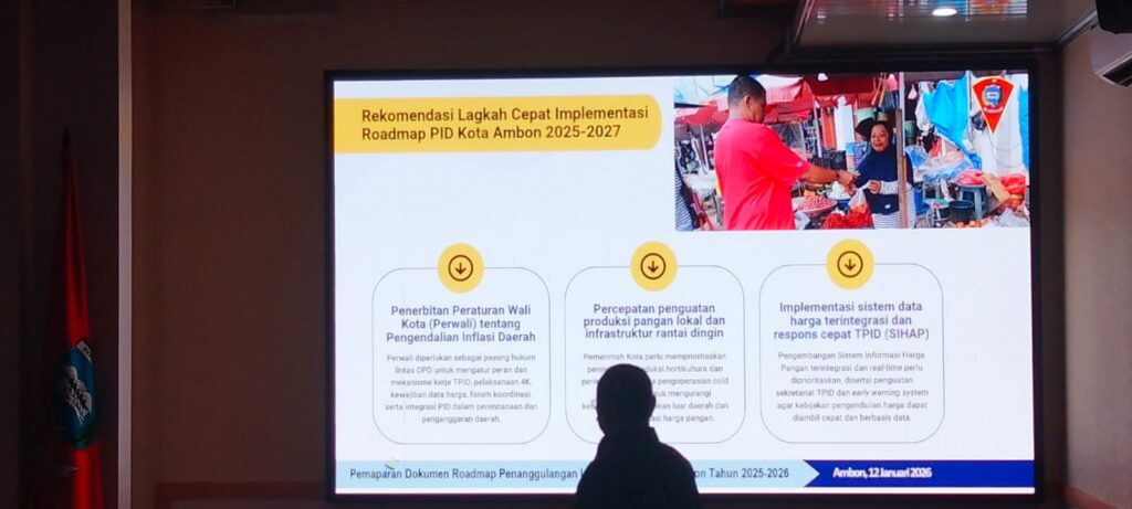 JURNALMALUKU – Pemerintah Kota (Pemkot) Ambon menegaskan komitmennya menjaga stabilitas inflasi melalui pertemuan bersama Tim Pengendalian Inflasi Daerah (TPID) Kota Ambon dan tim penyusunan Roadmap Pengendalian Inflasi 2025–2027. Pertemuan tersebut berlangsung di Ruang Vlissingen, Balai Kota Ambon, Jumat (30/1/2026).