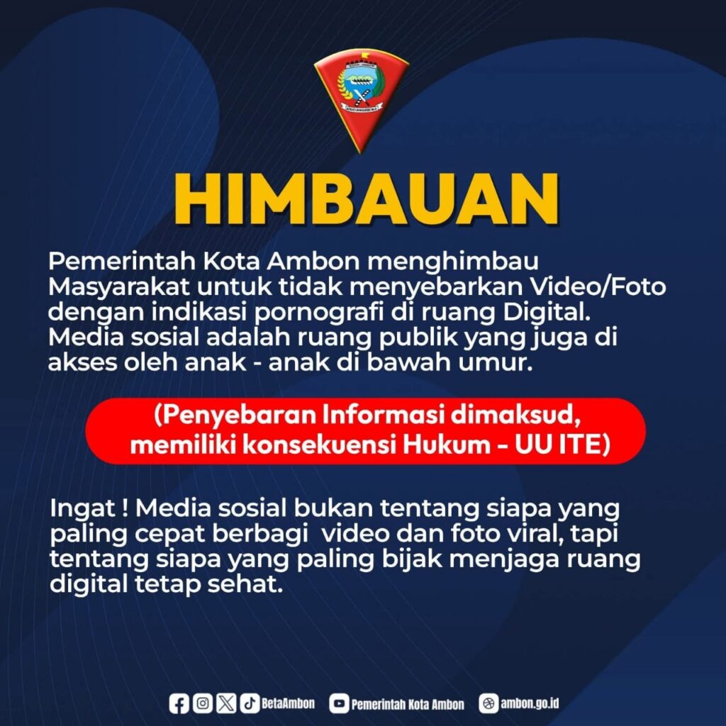 JURNALMALUKU – Pemerintah Kota Ambon mengeluarkan imbauan tegas kepada seluruh masyarakat agar tidak menyebarkan video maupun foto yang mengandung indikasi pornografi di ruang digital, khususnya melalui media sosial.