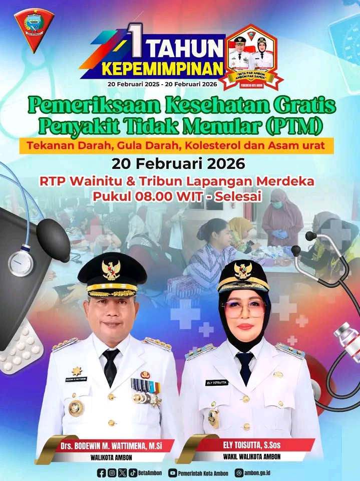 JURNALMALUKU – Pemerintah Kota Ambon mengajak seluruh masyarakat untuk mengikuti kegiatan Pemeriksaan Kesehatan Gratis Penyakit Tidak Menular (PTM) yang akan dilaksanakan pada Jumat, 20 Februari 2026.