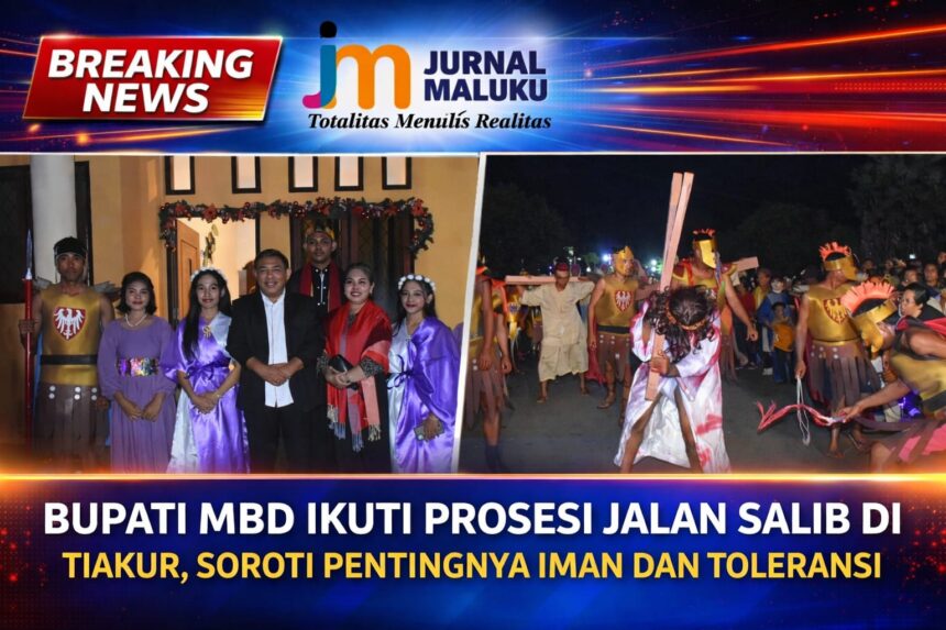 JURNALMALUKU – Bupati Maluku Barat Daya (MBD), Benyamin Th. Noach, bersama Ketua TP-PKK Kabupaten MBD, Ny. Rely Noach menghadiri kegiatan Jalan Salib (Via Dolorosa) yang diselenggarakan Jemaat GPM Tiakur dalam rangka memperingati Paskah Kristus Tahun 2026, Jumat (5/4/2026).